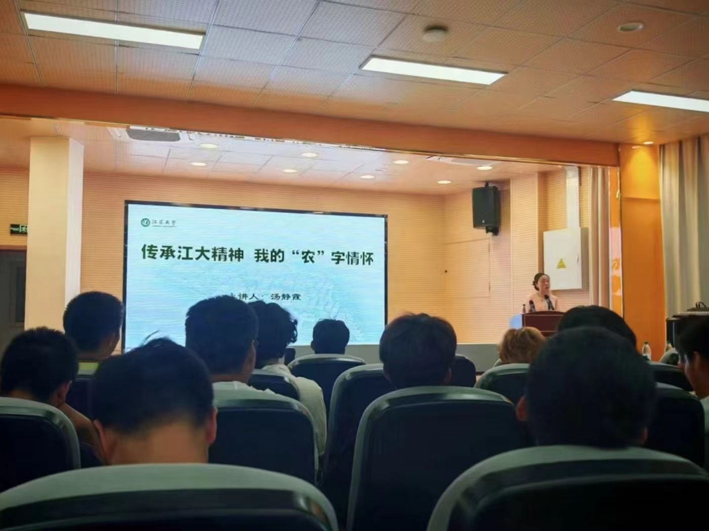 国庆节前夕,校关工委副主任、校“中国共产党人精神谱系”讲师团成员汤静霞受邀在学苑楼二楼报告厅开设以“传承江大精神--我的“农”字情怀”为主题的信仰公开课。伟德betvlctor1946源于英国2024级全体本科生新生到场学习,学院党委书记廖志凌、团委书记申成斌共同参加活动。