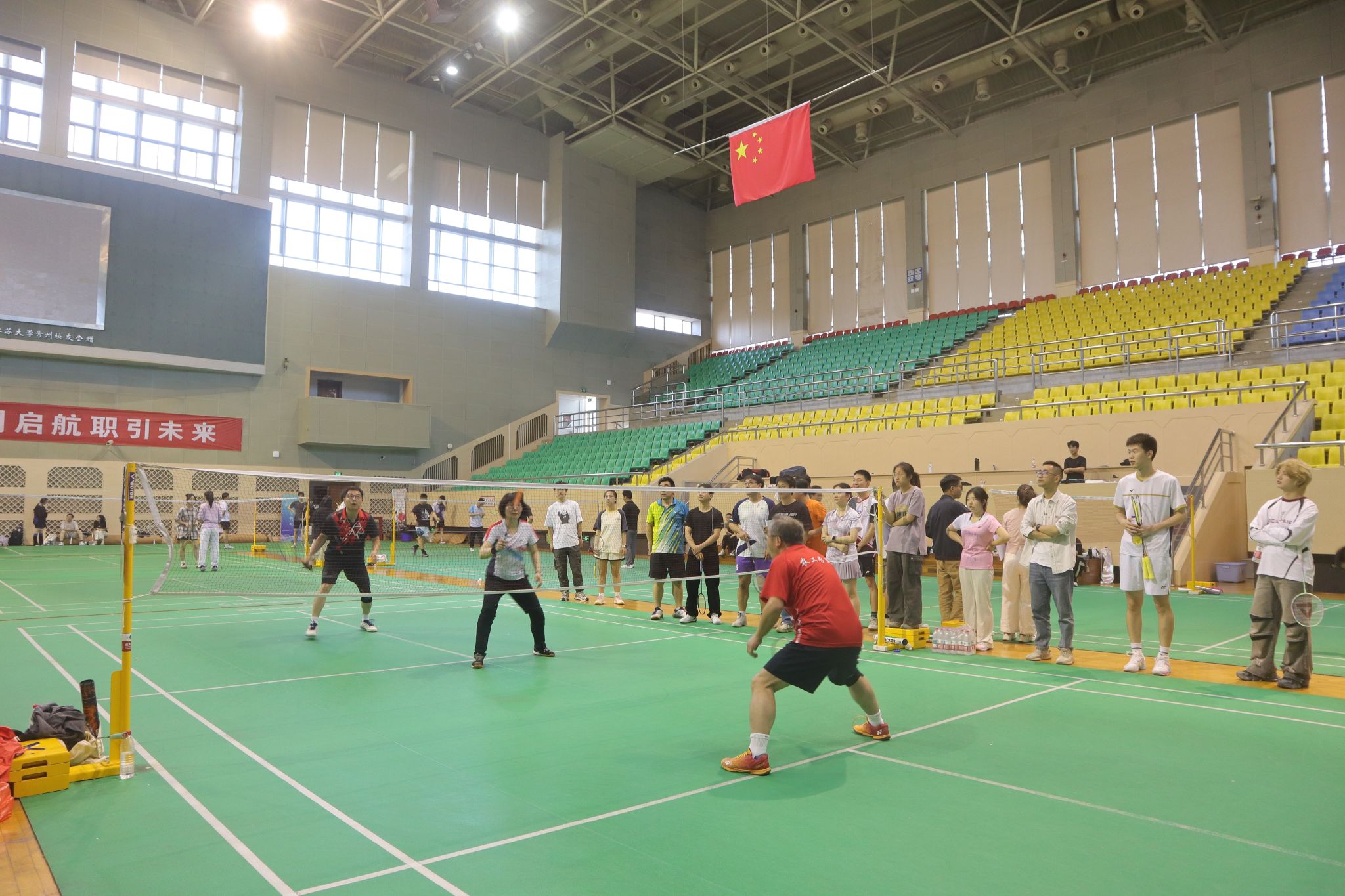 在羽毛球馆内,陈树人老师身着运动装束,先后参与男双、混双等比赛项目,通过实战演示发球技巧、攻防策略等专业要领。赛后,陈老师结合赛场表现开展微座谈,强调“体育竞技与学术研究具有相通性,都需要精准判断、团队协作和永不言败的精神”。