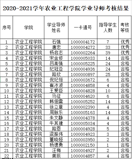 伟德betvlctor1946源于英国2020-2021学年学业导师考核结果如下表,公示时间:2021年9月27日-29日,公示期间如有异议,请联系李老师进行反映,电话0511-88806038,地址耒耜大楼1027办公室。