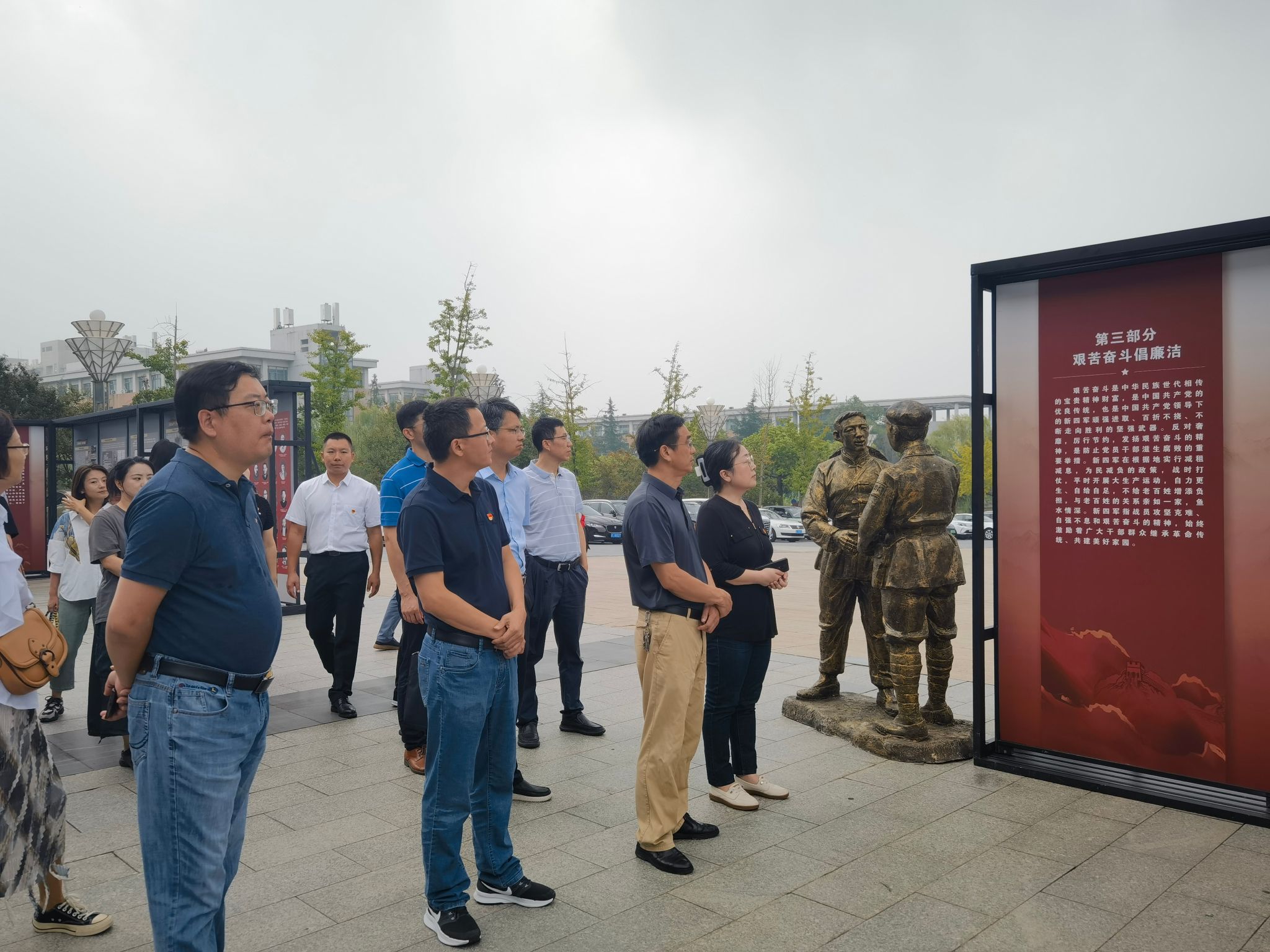 9月30日国庆前夕,伟德betvlctor1946源于英国组织学院党委委员、师生党支部书记和支部纪检委员参观在学校图书馆广场举办的“崇高风范 清廉丰碑——新四军廉洁思想文化史实展”。